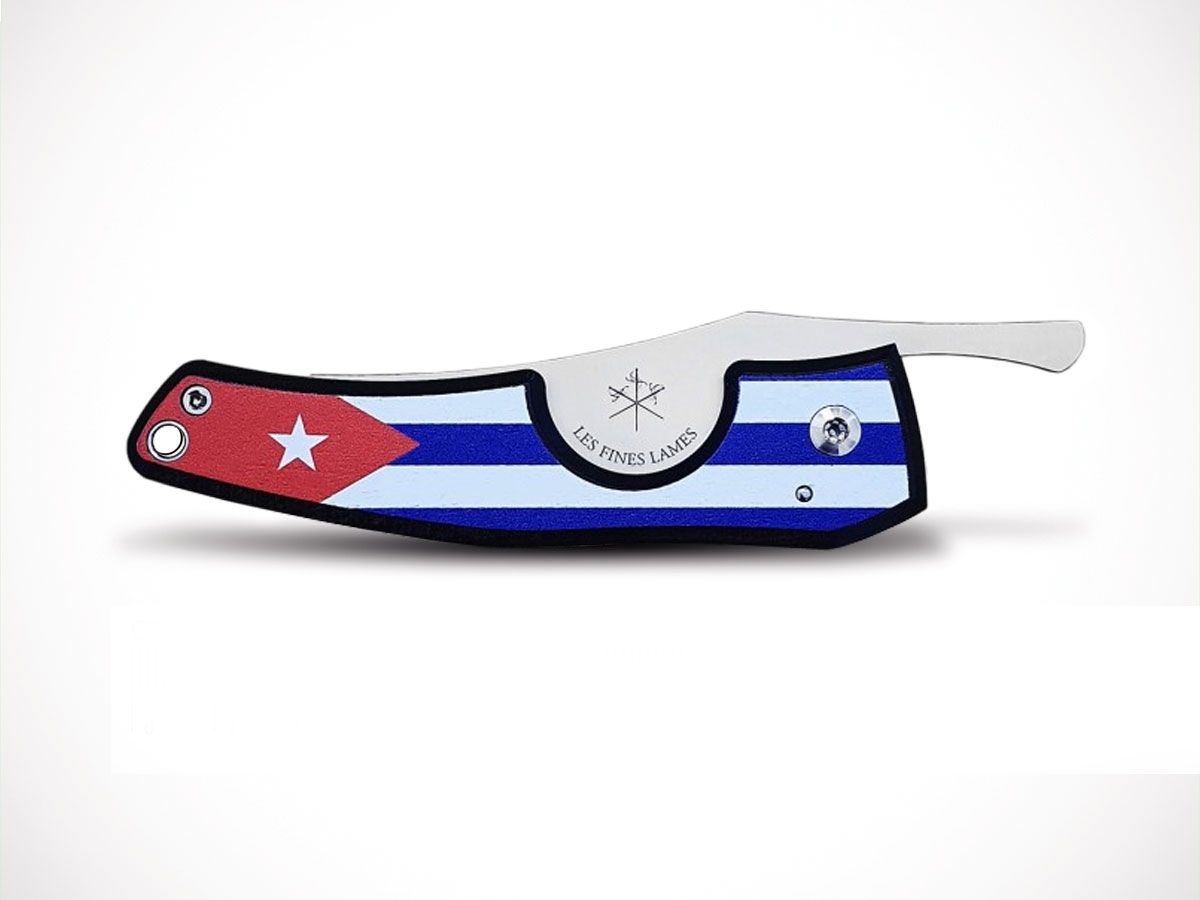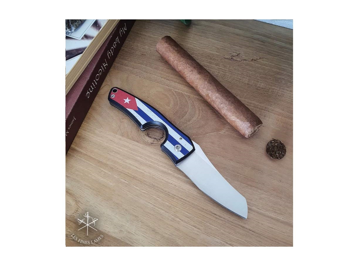 LE PETIT \"FLAG-CUBA DARK\" di LES FINES LAMES è un coltellino pieghevole tascabile multifunzionale, che può essere usato anche come un pratico tagliasigari che permette di ottenere tagli pulitissimi. Si apre facilmente con una mano grazie alla Lens, una leva in metallo situata nell\'estensione della lama, caratteristica tipica dei coltelli pieghevoli piemontesi. La sua apertura di 23 mm può tagliare a metà un sigaro da 58 RG e la testa di sigari fino a 70 RG.