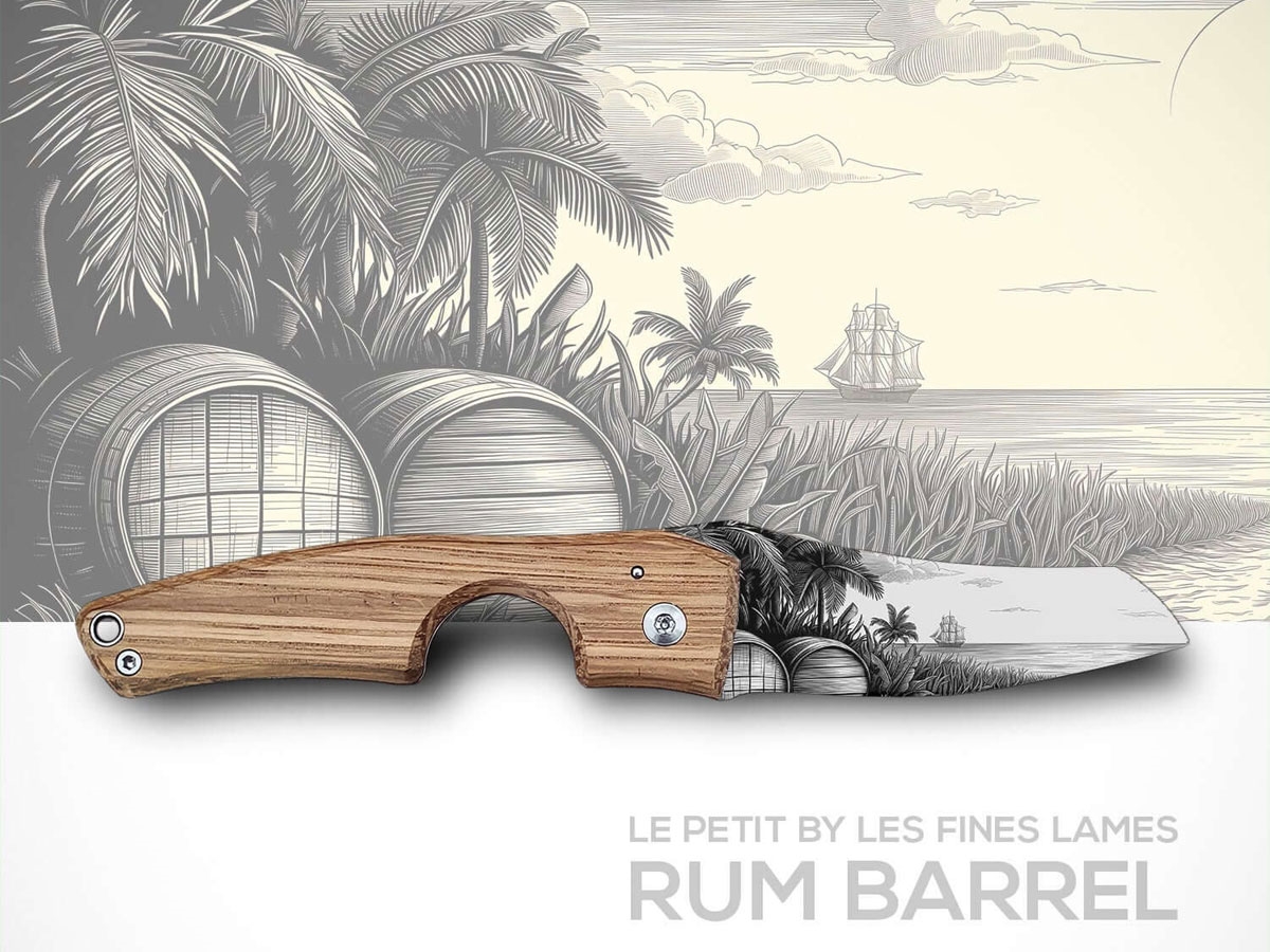 LE PETIT "BARREL RUM" di LES FINES LAMES è un coltellino pieghevole tascabile multifunzionale, che può essere usato anche come un pratico tagliasigari che permette di ottenere tagli pulitissimi. Si apre facilmente con una mano grazie alla Lens, una leva in metallo situata nell'estensione della lama, caratteristica tipica dei coltelli pieghevoli piemontesi. La sua apertura di 23 mm può tagliare a metà un sigaro da 58 RG e la testa di sigari fino a 70 RG.