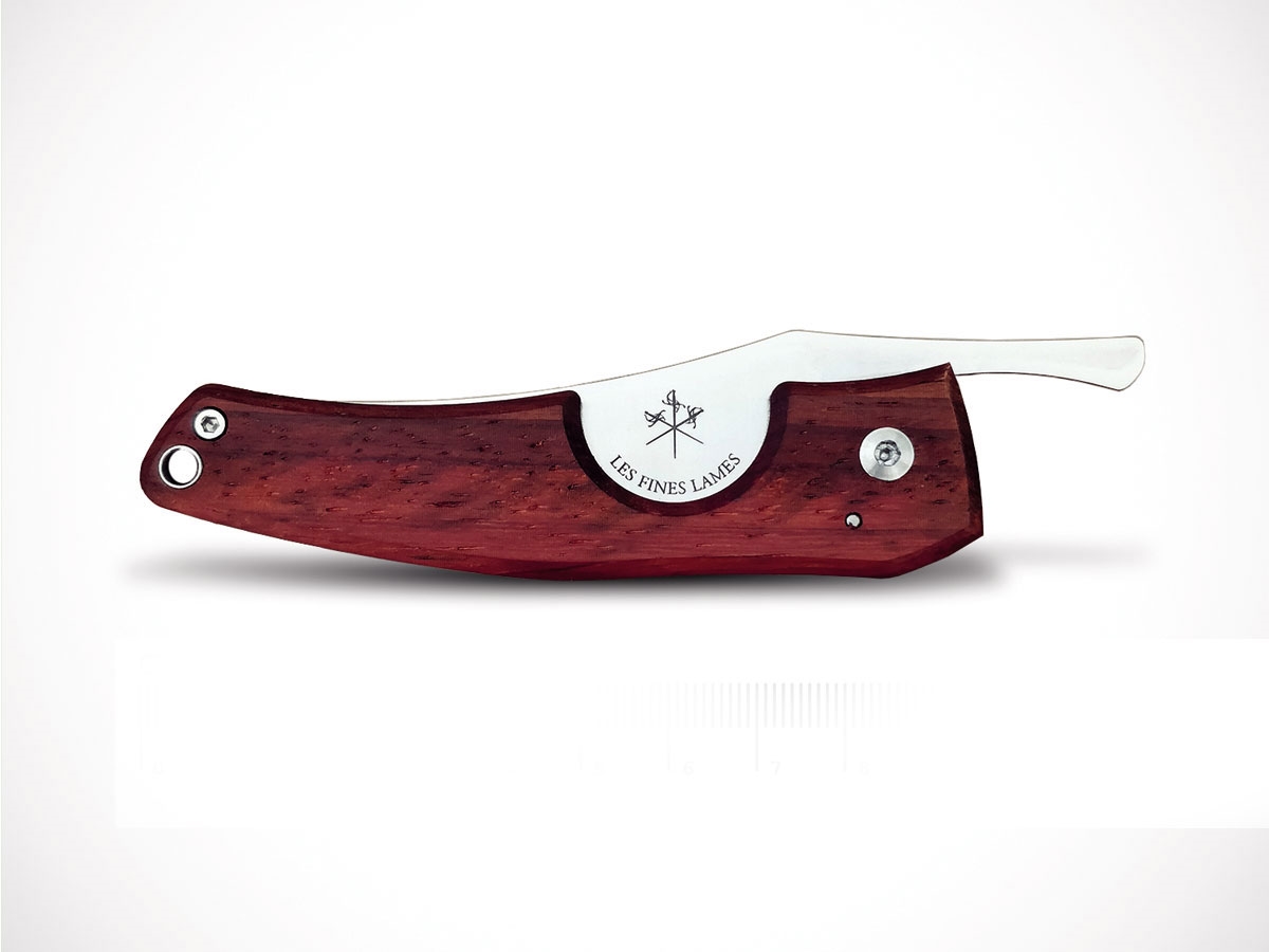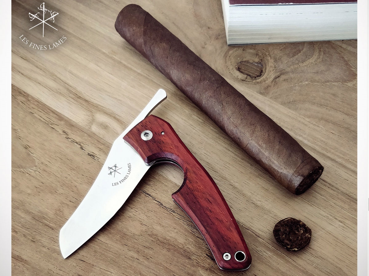 LE PETIT \"PADOUK\" di LES FINES LAMES è un coltellino pieghevole tascabile multifunzionale, che può essere usato anche come un pratico tagliasigari che permette di ottenere tagli pulitissimi. Si apre facilmente con una mano grazie alla Lens, una leva in metallo situata nell\'estensione della lama, caratteristica tipica dei coltelli pieghevoli piemontesi. La sua apertura di 23 mm può tagliare a metà un sigaro da 58 RG e la testa di sigari fino a 70 RG.