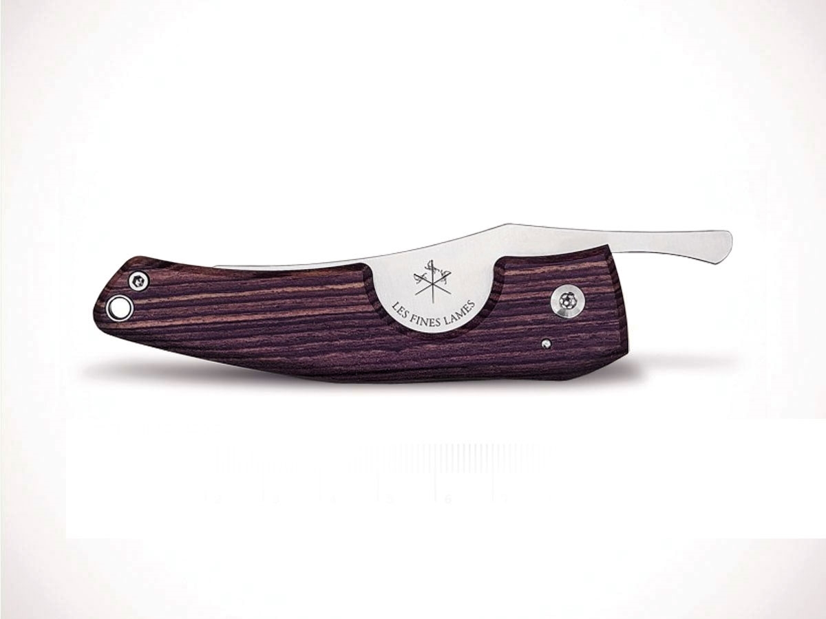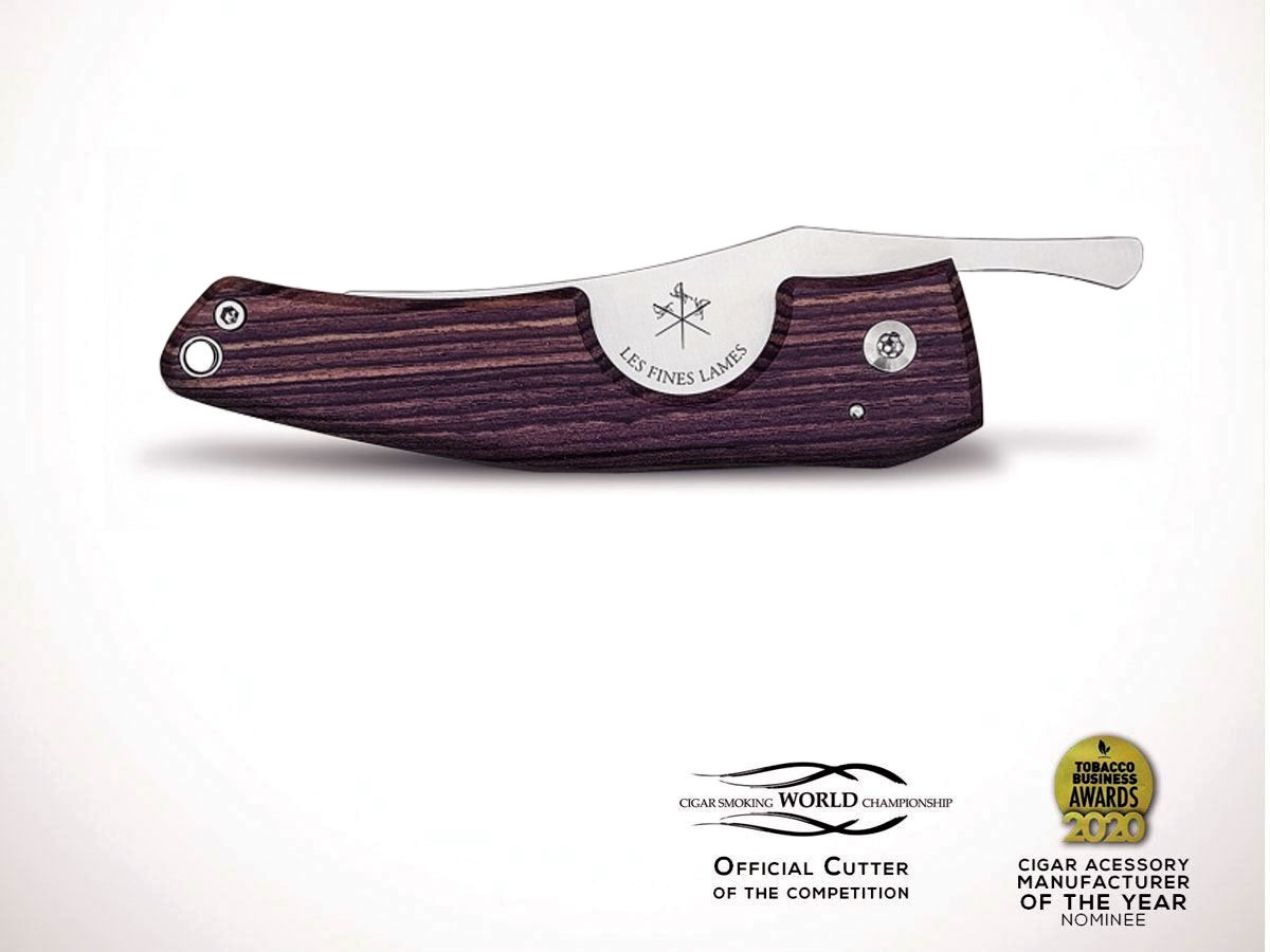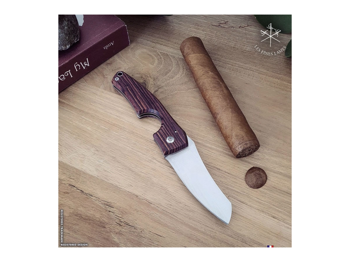 LE PETIT \"KINGWOOD\" di LES FINES LAMES è un coltellino pieghevole tascabile multifunzionale, che può essere usato anche come un pratico tagliasigari che permette di ottenere tagli pulitissimi. Si apre facilmente con una mano grazie alla Lens, una leva in metallo situata nell\'estensione della lama, caratteristica tipica dei coltelli pieghevoli piemontesi. La sua apertura di 23 mm può tagliare a metà un sigaro da 58 RG e la testa di sigari fino a 70 RG.