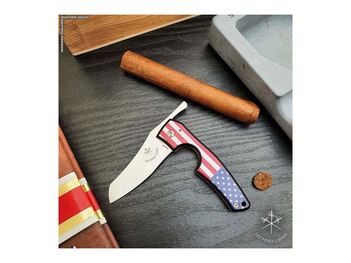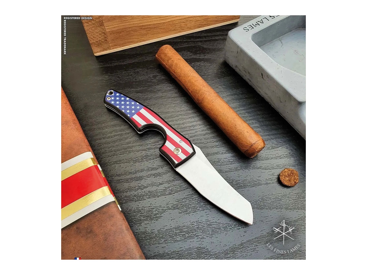 LE PETIT \"FLAG-USA DARK\" di LES FINES LAMES è un coltellino pieghevole tascabile multifunzionale, che può essere usato anche come un pratico tagliasigari che permette di ottenere tagli pulitissimi. Si apre facilmente con una mano grazie alla Lens, una leva in metallo situata nell\'estensione della lama, caratteristica tipica dei coltelli pieghevoli piemontesi. La sua apertura di 23 mm può tagliare a metà un sigaro da 58 RG e la testa di sigari fino a 70 RG.