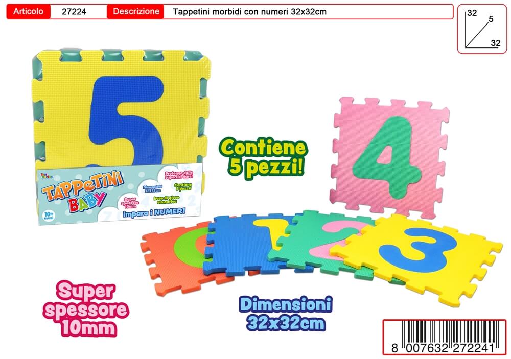 Il Tappetino Numeri è perfetto per creare un'area gioco sicura e educativa per i bambini. Con i suoi numeri colorati, questo tappetino aiuta i più piccoli a imparare i numeri divertendosi.• Materiale Morbido e Sicuro: Realizzato in materiale EVA di alta qualità, il tappetino è morbido, sicuro e privo di sostanze tossiche, garantendo un ambiente di gioco sicuro per i bambini.• Design Educativo: Ogni pezzo del tappetino presenta un numero, favorendo l'apprendimento dei numeri e la familiarizzazione con la matematica fin dai primi mesi.• Dimensioni Pratiche: Ogni pezzo misura 32x32 cm con uno spessore di 10 mm, offrendo un'ampia superficie di gioco e un comfort ottimale.• Facile da Montare: I pezzi del tappetino si incastrano facilmente, permettendo ai bambini di sviluppare abilità motorie mentre assemblano il tappeto.• Versatile: Ideale per creare uno spazio di gioco in camerette, salotti, scuole materne e aree gioco.Contenuto del Pacchetto:5 pezzi di tappetino con numeriDimensioni:Ogni pezzo: 32x32 cmSpessore: 10 mmQuesto tappetino è perfetto per i genitori che desiderano un'area di gioco sicura e educativa per i loro bambini. I numeri colorati e il design interattivo offrono infinite possibilità di apprendimento e divertimento.