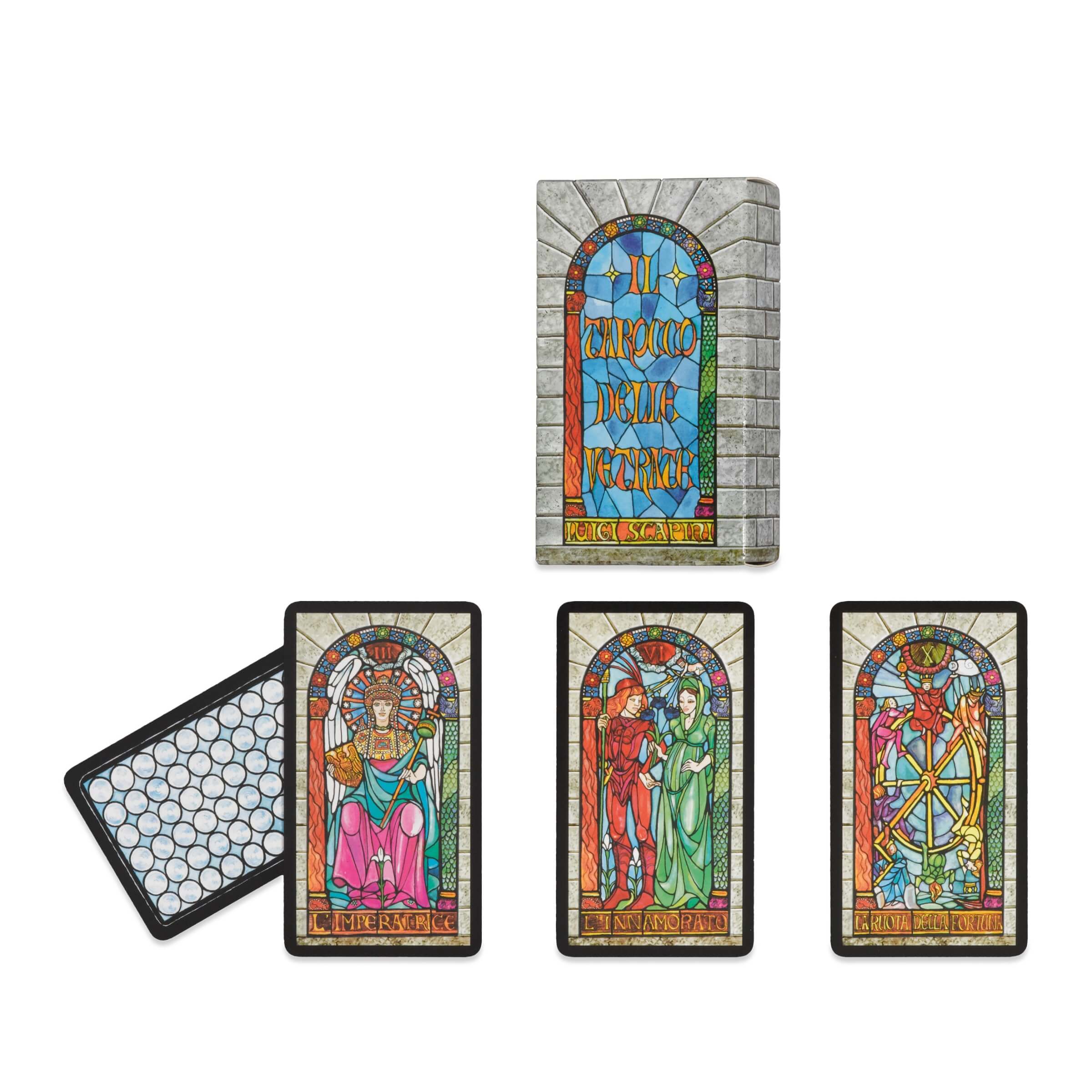 Il Tarocco delle Vetrate nasce da un immaginario visivo fortemente evocativo, in cui ogni carta diventa una piccola opera d’arte capace di catturare la luce e trasformarla in simboli e narrazioni. Le illustrazioni di Luigi Scapini richiamano l’eleganza delle vetrate istoriate, con colori intensi, contorni netti e una costruzione grafica che rimanda alle antiche cattedrali, dove ogni scena sacra racconta un percorso interiore. Questo mazzo da 78 carte, completo di 22 Arcani maggiori e 56 Arcani minori, invita a un’esperienza visiva e simbolica profonda, adatta a chi desidera avvicinarsi al mondo dei Tarocchi attraverso un linguaggio artistico ricco di dettagli e valori simbolici. La presenza del libretto in italiano permette di esplorare significati, interpretazioni e riferimenti stilistici, offrendo una guida chiara per comprendere meglio ogni immagine e il suo ruolo nei percorsi di consultazione o meditazione.• Illustrazioni a vetrata: Ogni carta presenta un disegno ispirato alle vetrate artistiche, con un uso armonioso dei colori e delle composizioni che rendono la lettura visiva immediata e coinvolgente.• Arcani maggiori ricchi di simboli: Le 22 carte principali sono raffigurate in modo dettagliato, con elementi iconografici che rispondono alla tradizione esoterica e facilitano l’interpretazione intuitiva e meditativa.• Arcani minori strutturati con chiarezza: I semi e le figure degli Arcani minori sono rappresentati con equilibrio e leggibilità, permettendo un uso fluido anche per chi si avvicina ai Tarocchi per la prima volta.• Libretto in italiano: All’interno è presente un libretto che accompagna il mazzo con spiegazioni, riferimenti simbolici e indicazioni utili per chi desidera approfondire i significati di ogni carta.• Formato omogeneo e maneggevole: Ogni carta misura mm 66x119, una dimensione comoda sia per chi le utilizza in lettura sia per chi desidera conservarle come oggetto da collezione o come strumento di studio artistico.Questo Tarocco si presentia come un mazzo che unisce arte, introspezione e tradizione, offrendo un percorso che si sviluppa attraverso luce, colore e simboli. Le immagini creano un’atmosfera contemplativa che incoraggia a soffermarsi sui dettagli e a cercare connessioni interiori, trasformando ogni consultazione in un momento di riflessione personale. L’effetto delle vetrate amplifica la percezione delle emozioni e delle energie rappresentate, rendendo l’esperienza visiva più ricca e suggestiva.