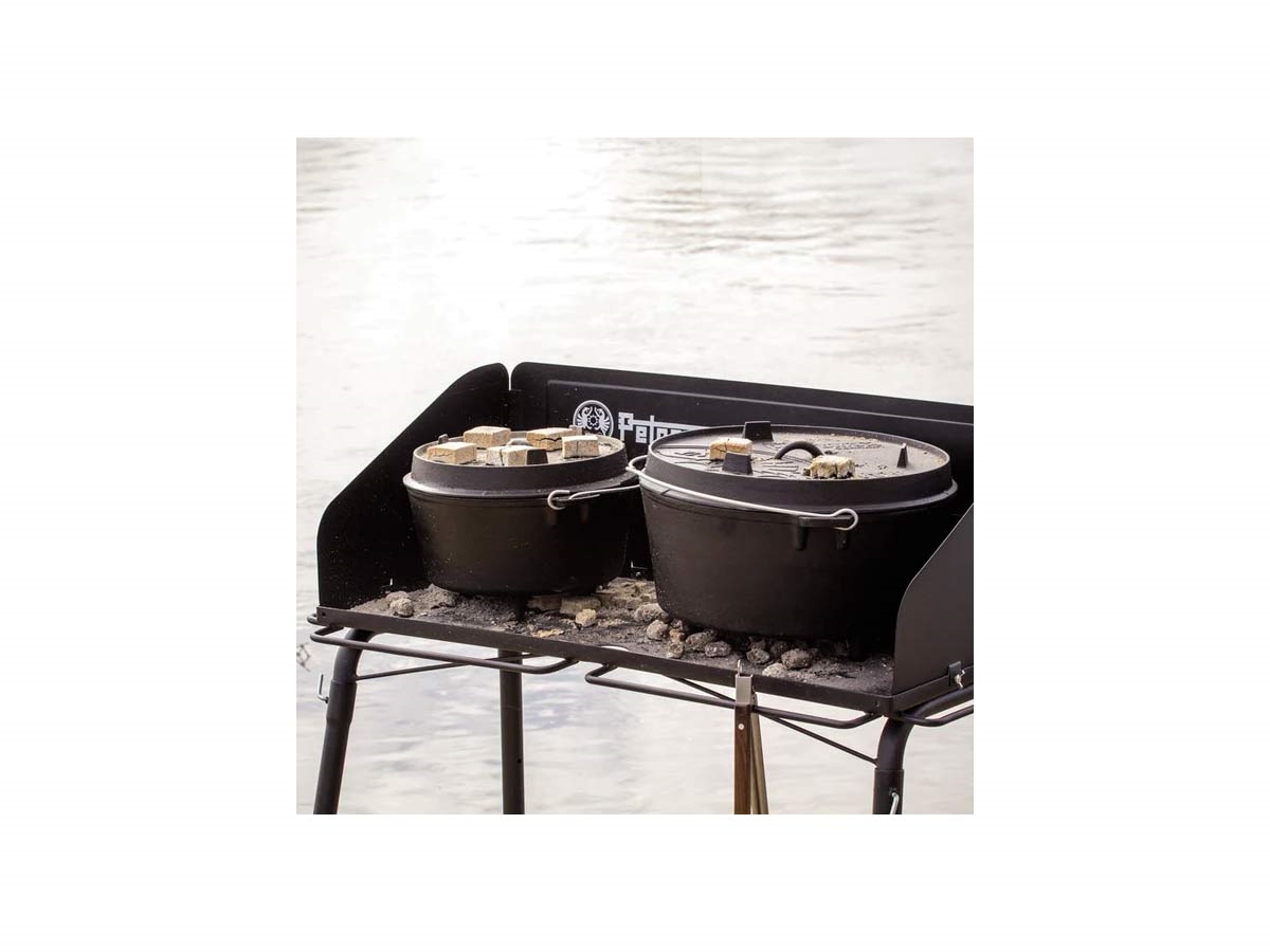 Con le sue gambe solide, il tuo tavolo bracieri può supportare fino a 100 kg (carico massimo della superficie). Puoi anche rimuovere facilmente le gambe se lo desideri e posizionare il tuo tavolo Dutch Oven su qualsiasi superficie resistente al calore. Mentre cucini, puoi comodamente attaccare pinze per carbonella, strofinacci, guanti da griglia, ecc. nella parte anteriore e laterale a portata di mano.