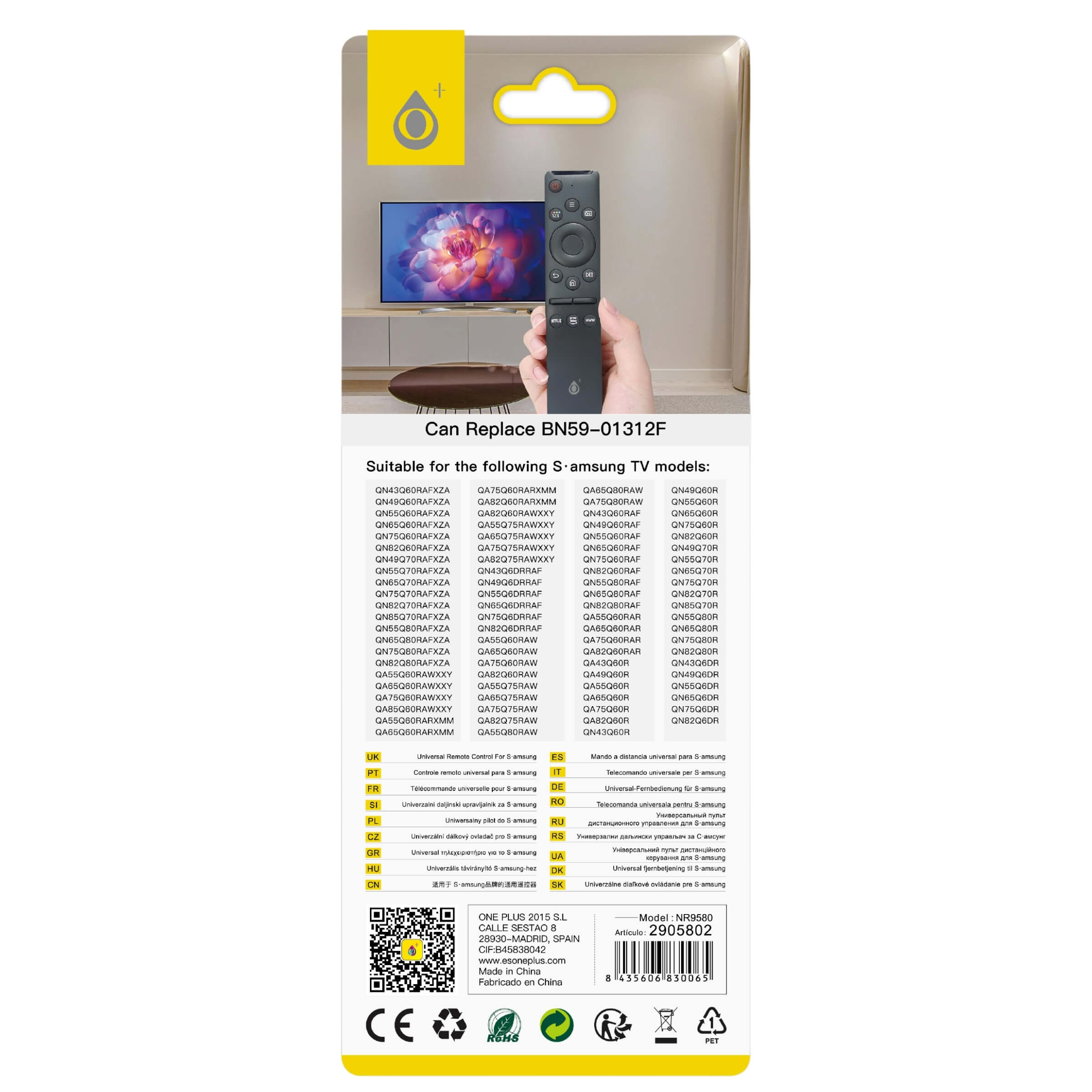 Il telecomando universale NR9580 è progettato per offrire un controllo completo della tua TV Samsung, garantendo compatibilità con una vasta gamma di modelli e supportando funzioni avanzate come l'accesso diretto a Netflix, Prime Video e WWW. Un accessorio indispensabile per chi desidera una soluzione pratica e immediata senza la necessità di programmazione.• Materiale resistente (ABS): Realizzato in materiale ABS di alta qualità, garantisce robustezza e resistenza nel tempo, ideale per un utilizzo quotidiano.• Compatibilità estesa: Supporta TV Samsung con tecnologia LCD, LED, Plasma e Smart TV. È compatibile anche con modelli 4K Ultra HD, offrendo una versatilità senza paragoni.• Funzioni integrate: Accesso rapido ai principali servizi di streaming come Netflix, Prime Video e WWW, per un intrattenimento immediato e senza interruzioni.• Sostituisce il modello BN59-01312F: Questo telecomando può facilmente sostituire il modello BN59-01312F, garantendo la piena funzionalità con i TV Samsung compatibili.• Ampia distanza operativa: Funziona fino a una distanza massima di 8 metri, permettendo di controllare il tuo dispositivo anche da lontano con precisione.• Alimentazione pratica: Funziona con 2 batterie AA (non incluse), offrendo un'autonomia duratura e una facile sostituzione.• Certificazioni di sicurezza: Il prodotto è certificato secondo gli standard CE, RoHS e FCC, garantendo sicurezza e affidabilità durante l'uso.• Dimensioni compatte: Misura 16.5 x 3.5 x 2.55 cm, risultando comodo da maneggiare e facile da riporre quando non in uso.Il telecomando universale NR9580 è la soluzione ideale per chi desidera un controllo semplice e immediato della propria TV Samsung, senza la necessità di configurazioni complicate.