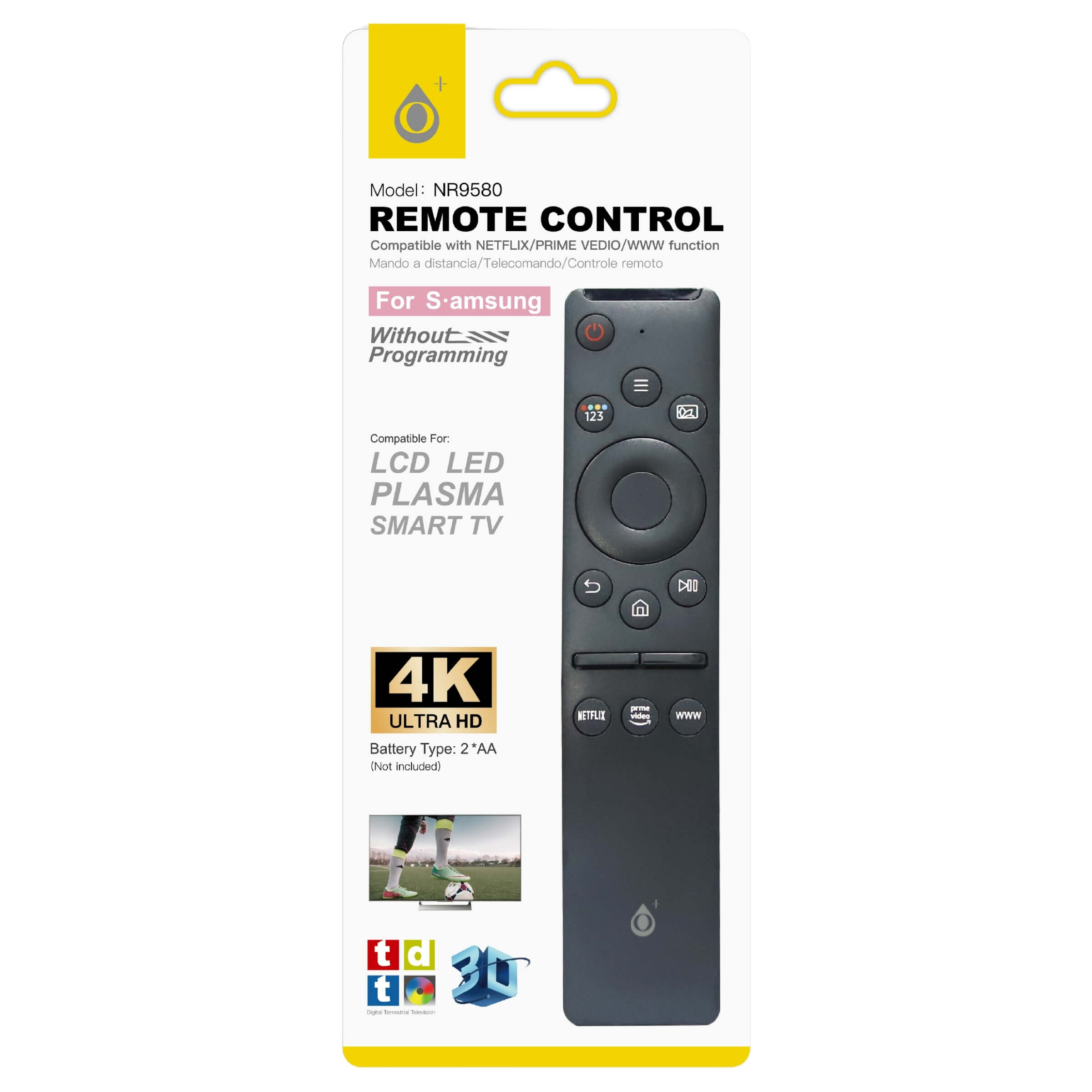 Il telecomando universale NR9580 è progettato per offrire un controllo completo della tua TV Samsung, garantendo compatibilità con una vasta gamma di modelli e supportando funzioni avanzate come l'accesso diretto a Netflix, Prime Video e WWW. Un accessorio indispensabile per chi desidera una soluzione pratica e immediata senza la necessità di programmazione.• Materiale resistente (ABS): Realizzato in materiale ABS di alta qualità, garantisce robustezza e resistenza nel tempo, ideale per un utilizzo quotidiano.• Compatibilità estesa: Supporta TV Samsung con tecnologia LCD, LED, Plasma e Smart TV. È compatibile anche con modelli 4K Ultra HD, offrendo una versatilità senza paragoni.• Funzioni integrate: Accesso rapido ai principali servizi di streaming come Netflix, Prime Video e WWW, per un intrattenimento immediato e senza interruzioni.• Sostituisce il modello BN59-01312F: Questo telecomando può facilmente sostituire il modello BN59-01312F, garantendo la piena funzionalità con i TV Samsung compatibili.• Ampia distanza operativa: Funziona fino a una distanza massima di 8 metri, permettendo di controllare il tuo dispositivo anche da lontano con precisione.• Alimentazione pratica: Funziona con 2 batterie AA (non incluse), offrendo un'autonomia duratura e una facile sostituzione.• Certificazioni di sicurezza: Il prodotto è certificato secondo gli standard CE, RoHS e FCC, garantendo sicurezza e affidabilità durante l'uso.• Dimensioni compatte: Misura 16.5 x 3.5 x 2.55 cm, risultando comodo da maneggiare e facile da riporre quando non in uso.Il telecomando universale NR9580 è la soluzione ideale per chi desidera un controllo semplice e immediato della propria TV Samsung, senza la necessità di configurazioni complicate.