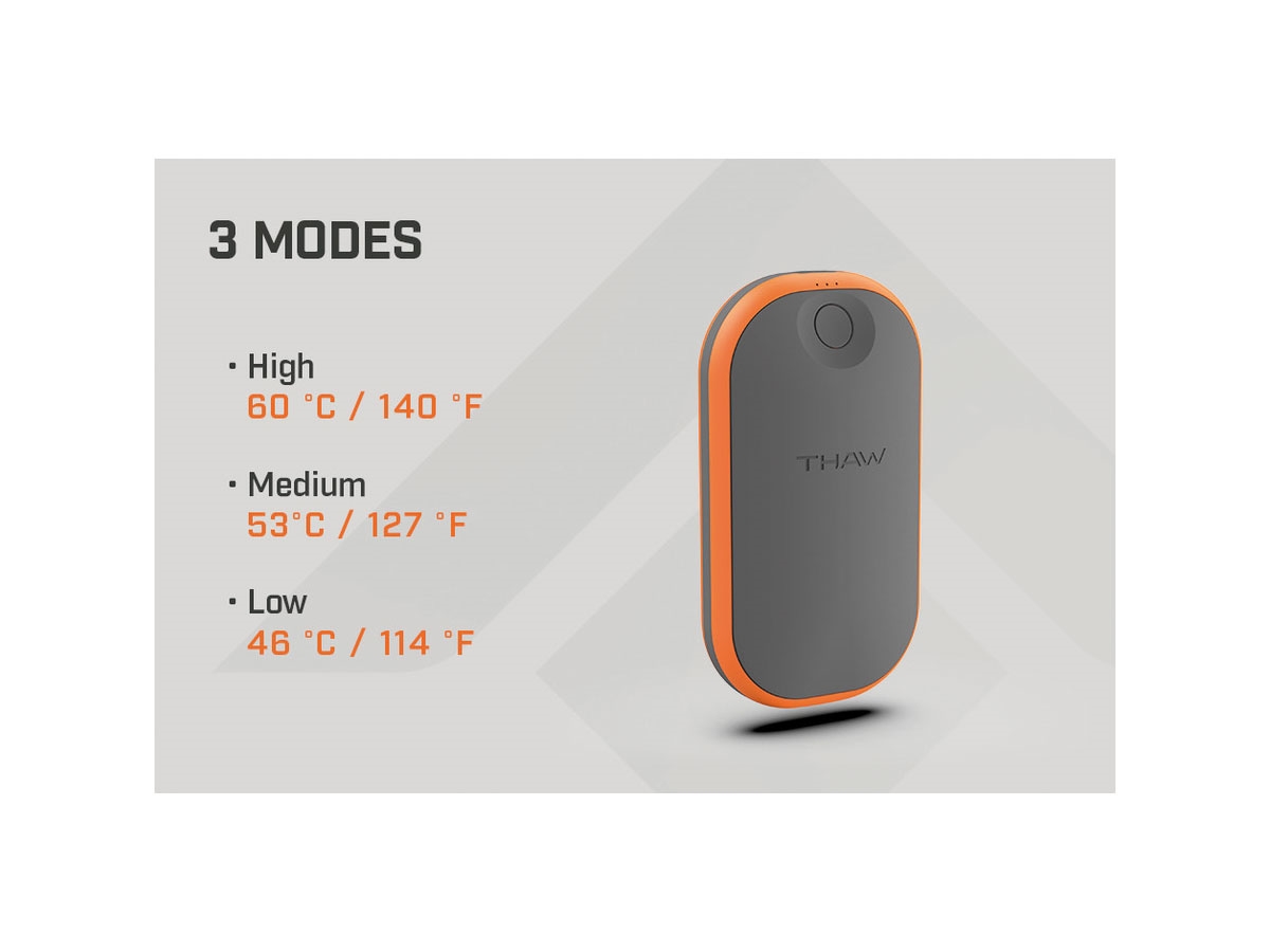 Scaldamani tascabile in grado di produrre calore per molte ore. Il design compatto si adatta ergonomicamente alla mano senza occupare molto spazio in tasca. Le modalità multiple forniscono calore intenso quando necessario o un'autonomia estremamente lunga quando è richiesto meno calore. Smart Power Control riduce il calore quando la batteria si scarica per prolungare l'autonomia. Il circuito di sicurezza regola la temperatura e protegge dal surriscaldamento. Il design ricaricabile include un power bank per ricaricare o alimentare altri dispositivi THAW o USB. Il design durevole presenta una struttura in ABS + alluminio e una resistenza agli urti di 1 metro.