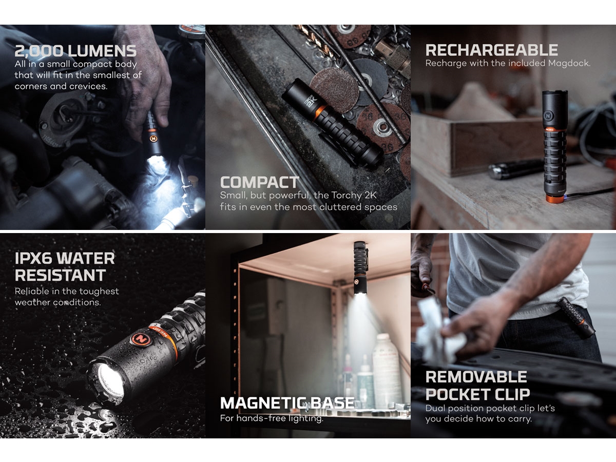 La TORCHY 2K è MagDock USB ricaricabile, resistente all'acqua (IPX6) ed è dotato di 5 modalità di illuminazione, che vengono trasferite senza problemi tramite Smart Power Control. Questa potente luce tascabile è dotata di una clip a 2 vie staccabile per un comodo trasporto e un'illuminazione a mani libere.