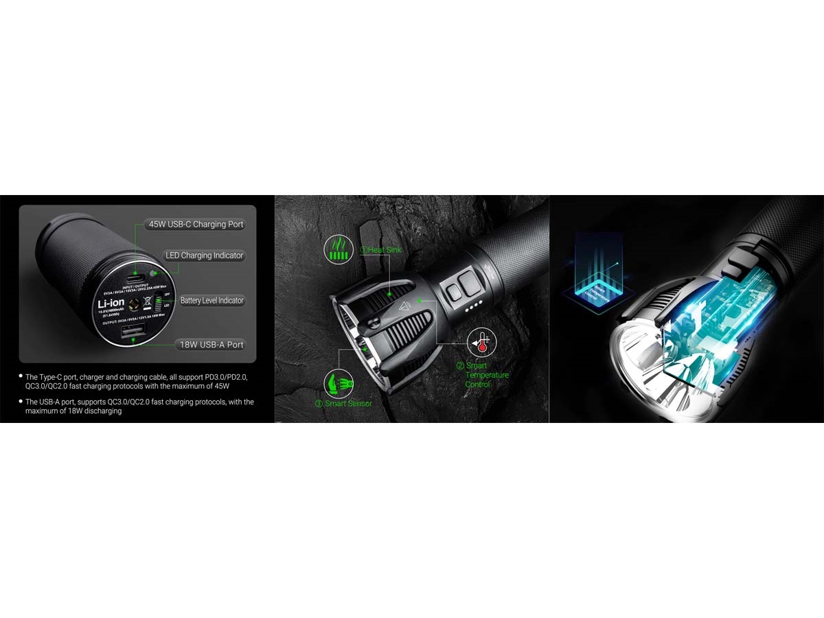 - Ricaricabile con doppio sistema : ricarica veloce 45W (45 minuti) o tramite USB-C- Pacchetto di 3 batterie da 4800 mAh che assicurano un lunga durata e che funziona da Powe bank- Indicatore di ricarica e di livello batteria - Temperature Management System: consente un'efficiente dissipazione del calore e garantisce sicurezza- Smart Temperature Control: regolazione automatica della luminosità in base alle condizioni di lavoro e alla temperatura superficiale dell'unità- Smart Sensor: riduzione automatica della luminosità se viene rilevato un ostacolo entro 1 metro
