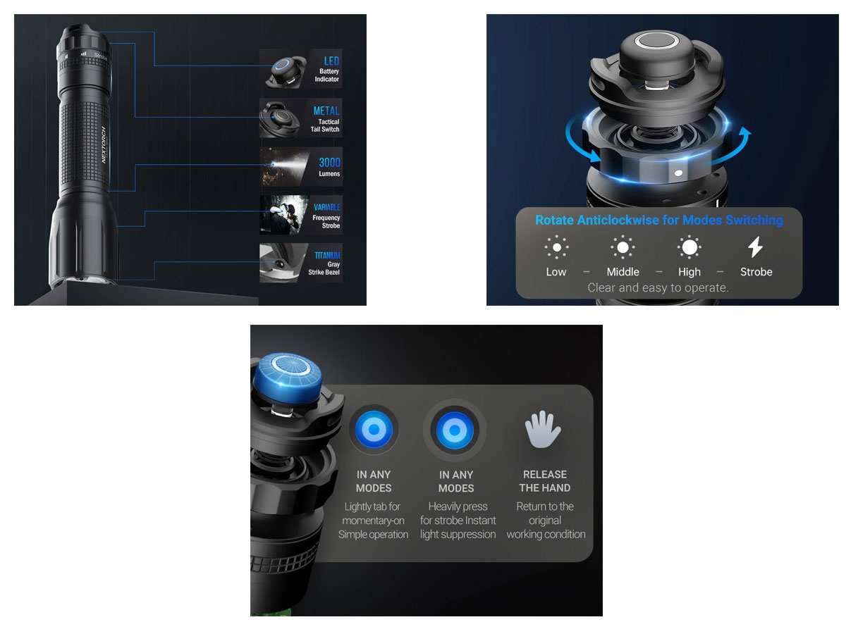 - Tecnologia Magnetica dell\' Interruttore con quadrante rotazionale - Tecnologia One-Step-Strobe: tocco leggero per modalità momentanea e pressione pesante per modalità tattica stroboscopica