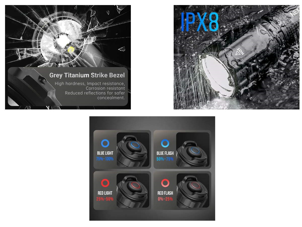 - Ricaricabile - 6 modalità di illuminazione: momentanea, stroboscopica tattica, alta, media, bassa e stroboscopica - Tecnologia Magnetica dell\' Interruttore con quadrante rotazionale - Tecnologia One-Step-Strobe: tocco leggero per modalità momentanea e pressione pesante per modalità tattica stroboscopica - Corona di sfondamento e di difesa in nano-ceramica - Indicatore di ricarica batteria a 4 stadi per tracciare il livello di alimentazione