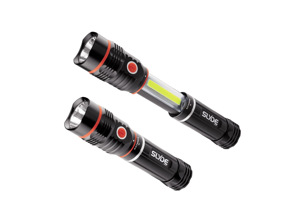 Combina una torcia LED con una lampada da lavoro COB LED, nascosta nel corpo e che appare facendo scorrere il corpo della torcia!