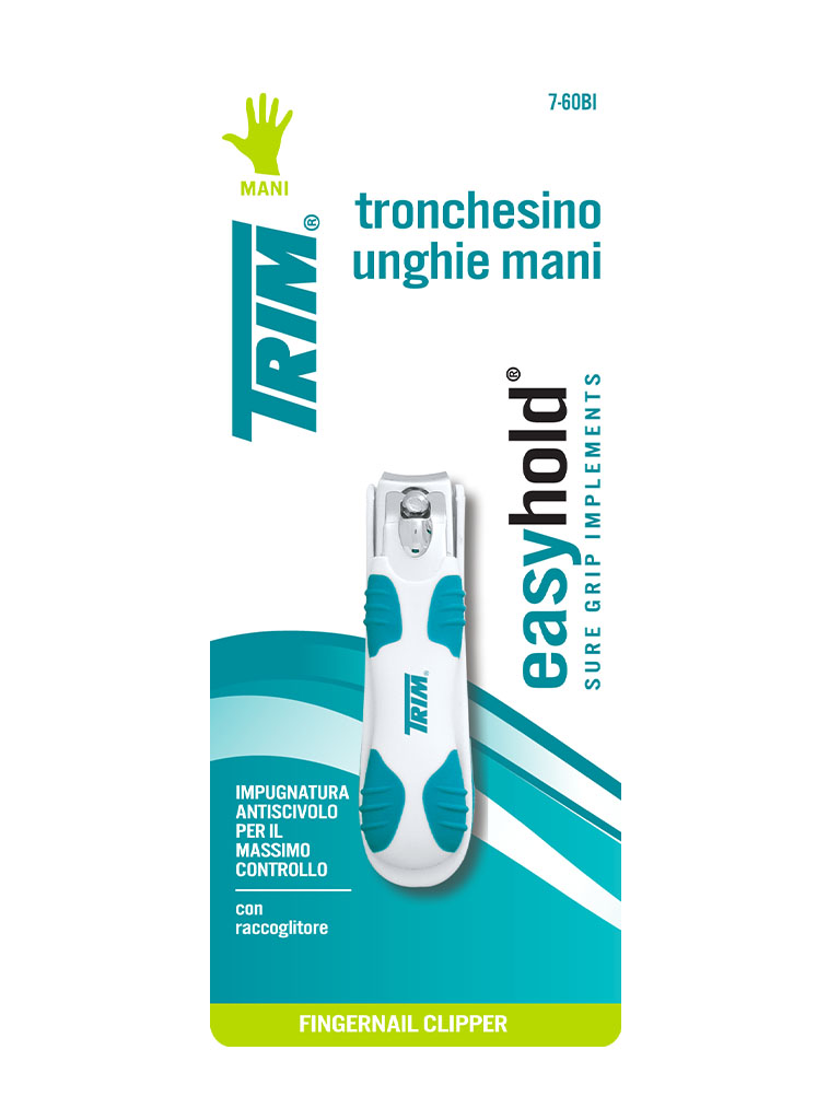 Tronchesino in acciaio nichelato e cromato per le unghie delle mani, con rivestimento di gomma antiscivolo capace di raccogliere al suo interno i residui di unghie prodotti al momento del taglio.