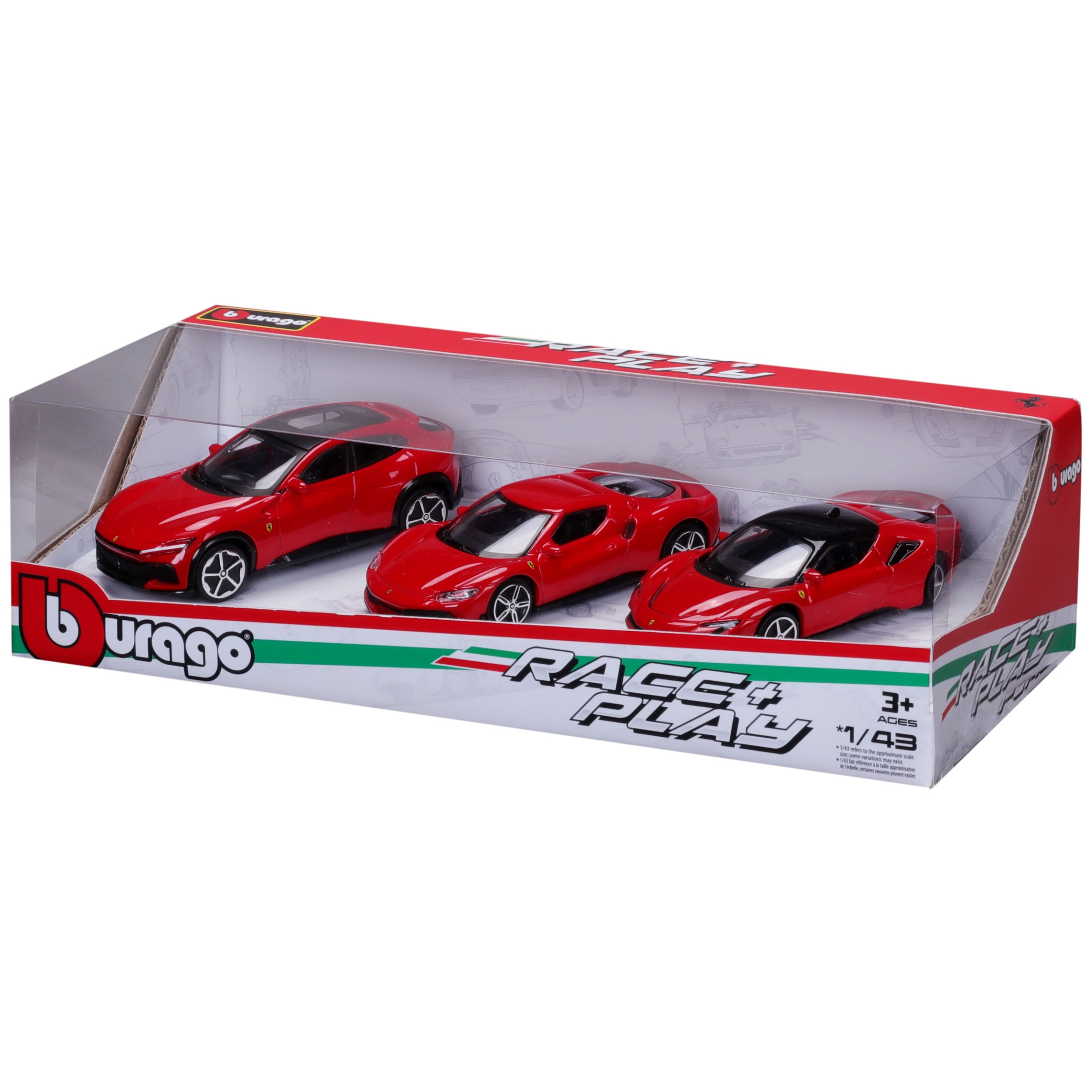 Il Gift Pack Ferrari 3 Modellini Auto Die Cast 1:43 è una selezione straordinaria di auto Ferrari in scala 1:43, perfetta per collezionisti e appassionati. Questa confezione regalo offre una varietà di modelli accuratamente riprodotti con dettagli eccezionali.• Dettagli Realistici: Ogni modellino è caratterizzato da una riproduzione fedele dei dettagli delle vetture Ferrari originali. Dai loghi agli elementi del design, ogni aspetto è curato per offrire un prodotto autentico e visivamente accattivante.• Materiale Die Cast di Alta Qualità: Realizzati in materiale Die Cast resistente, questi modellini garantiscono robustezza e durabilità nel tempo, rendendoli perfetti sia per l'esposizione che per il gioco.• Scala: La scala 1:43 consente di apprezzare ogni minimo dettaglio in una dimensione compatta e pratica, ideale per collezionisti che desiderano una collezione di alta qualità con un ingombro ridotto.• Design Iconico: I modellini catturano l'essenza delle vetture originali, con linee eleganti e colorazioni vivaci che rendono ogni pezzo un elemento distintivo nella tua collezione.• Ampia Selezione: Questo gift pack include 2 differenti assortimenti:Assortimento A:Ferrari 296 GTBPurosangueSF 90 StradaleAssortimento B:Monza SP2FXXX KRoma• Perfetto per Collezionisti: Questo gift pack è un'aggiunta eccellente per qualsiasi collezione di auto in scala, offrendo una selezione di modelli Ferrari che rappresentano l'eccellenza automobilistica italiana.Il Gift Pack Ferrari 3 Modellini Auto Die Cast 1:43 è il regalo perfetto per gli appassionati di Ferrari, combinando estetica e qualità in un'unica confezione. Ideale per chi desidera portare a casa un pezzo della leggenda Ferrari.