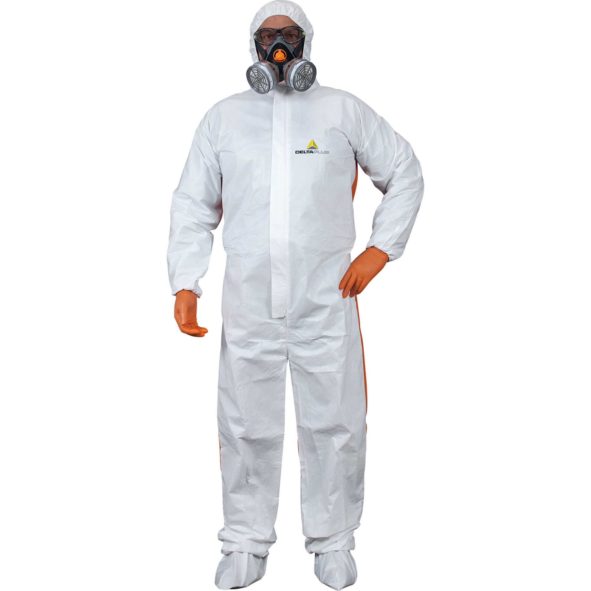 TUTA CON CAPPUCCIO ELASTICIZZATA NON TESSUTO (70% POLIPROPILENE 30% POLIETILENE). PARTE POSTERIORE 100% POLIPROPILENE SMS MOLTO TRASPIRANTE. CHIUSURA ZIP SOTTO BAVERINA. ELASTICO DI CHIUSURA IN TESTA, IN VITA, AI POLSI ED ALLE CAVIGLIE. 70% POLIPROPILENE 30% POLIETILENE - NON TESSUTO BIANCO. 100% POLIPROPILENE SMS - NON TESSUTO ARANCIONE. CATEGORIA DPI: 3. CERTIFICAZIONE CE. CONFORMITA' ALLE NORME EN ISO 13688:2013, EN ISO 13982-1:2004+A1:2010, EN13034:2005+A1:2009, EN1073-2:2002 E EN1149-5:2018.