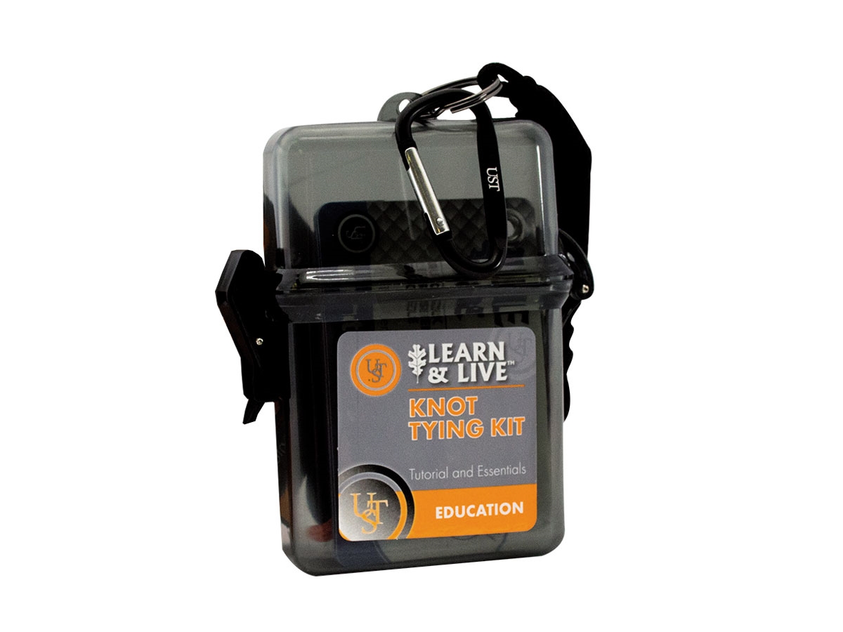 - Custodia in plastica a tenuta stagna con chiusura a scatto e cordino-  Schede istruttive su come legare con nodi- Corda (7,5m)-  Moschettone in alluminio (8cm)