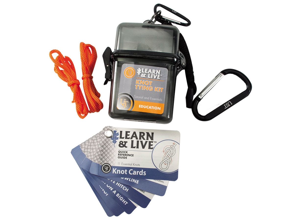 - Custodia in plastica a tenuta stagna con chiusura a scatto e cordino-  Schede istruttive su come legare con nodi- Corda (7,5m)-  Moschettone in alluminio (8cm)