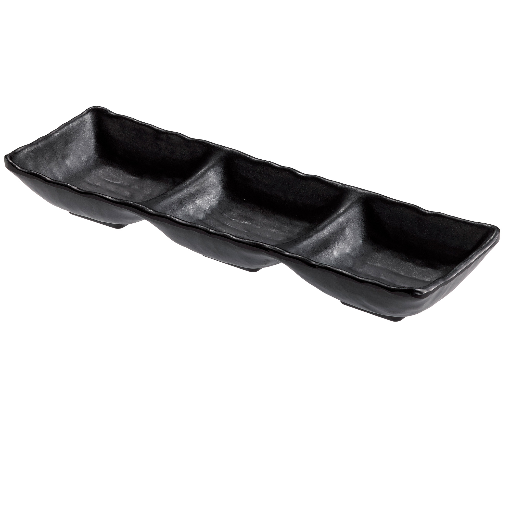VASSOIO A 3 SCOMPARTI IN MELAMINA NERA, 27X9X3,5 CM. PESO NETTO 210GR. CAPACITA': 90ML +90ML+90ML COLORE NERO. 100% MELAMINA, PRODOTTO IDONEO AL CONTATTO CON TUTTI I TIPI DI ALIMENTI (T MAX70 C). ARTICOLO LAVABILE IN LAVASTOVIGLIE DA NON UTILIZZARE CON UTENSILI TAGLIENTI. PRODOTTO DA NON UTILIZZARE UNITAMENTE ALL'ALIMENTO NEL FORNO TRADIZIONALE E FORNO A MICROONDE CONSERVARE IL PRODOTTO IN LUOGO ASCIUTTO,LONTANO DAI RAGGI DEL SOLE E FONTI DI CALORE(0 C+35 C).