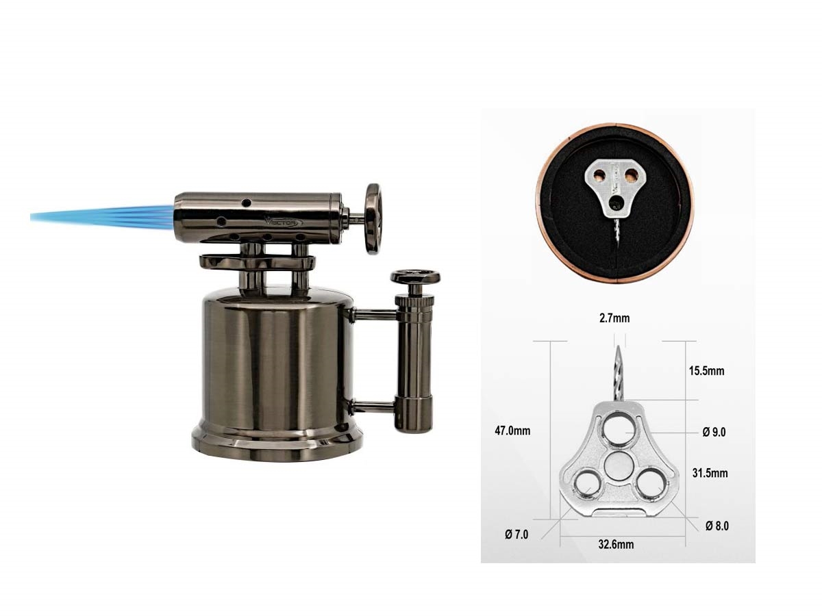 L'accendino da tavolo QUADPUMP ha una fiamma quadrupla a getto che resiste alle alte altitudini fino a 4.200 metri. Raggiunge una temperatura di combustione di 2400°F (circa 1300°C). Attaccato magneticamente alla base dell'accendino vi è inserito un accessorio staccabile che include tre forasigari da 7, 8 e 9 mm. ed un bucasigarii per risolvere i problemi di tiraggio del sigaro.