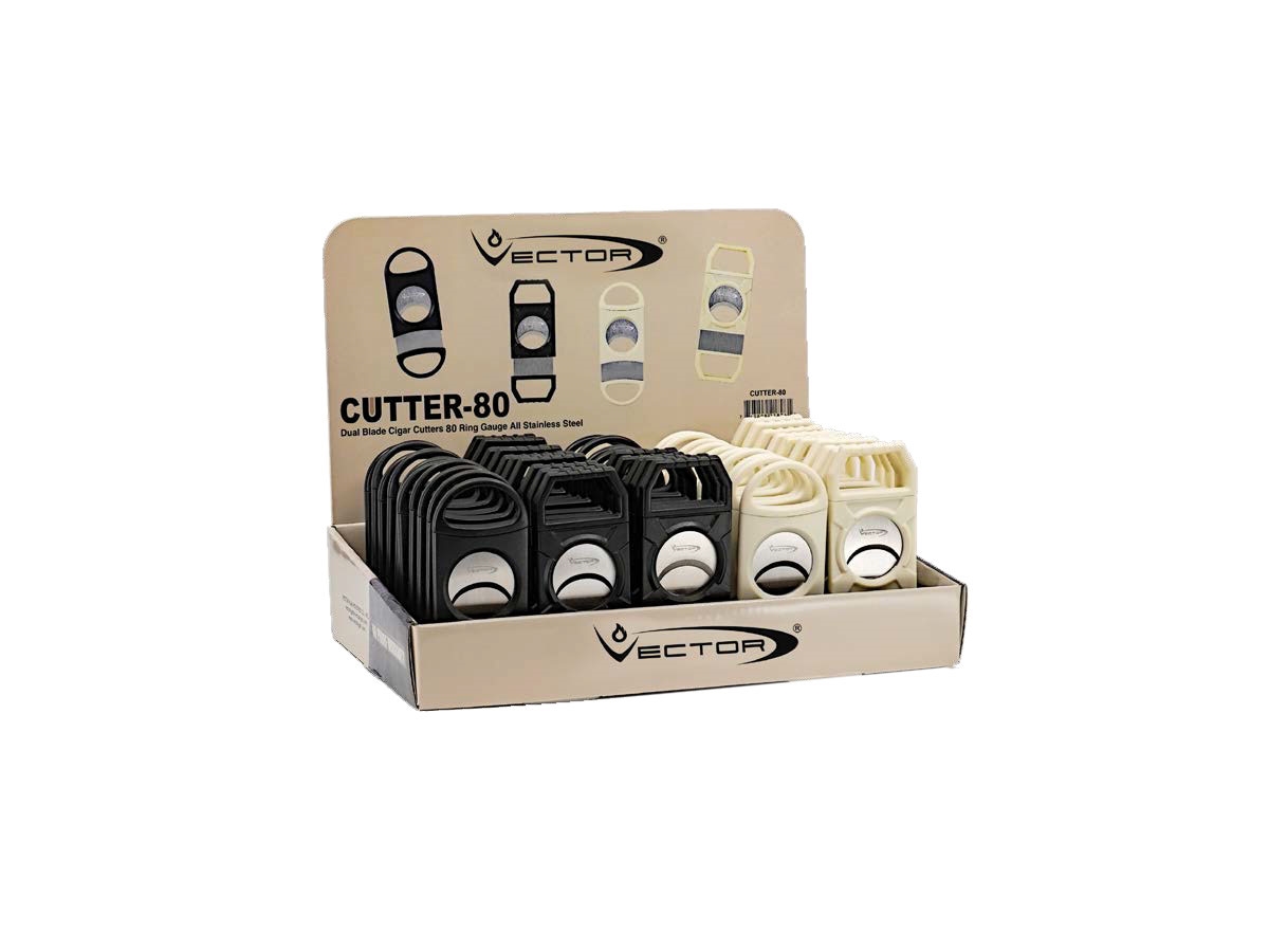 Il display in cartone contiene 50 tagliasigari a doppia lama in Stainless Steel per sigari fino a 80 RG. Hanno due differenti stili in due colori, bianco e nero.