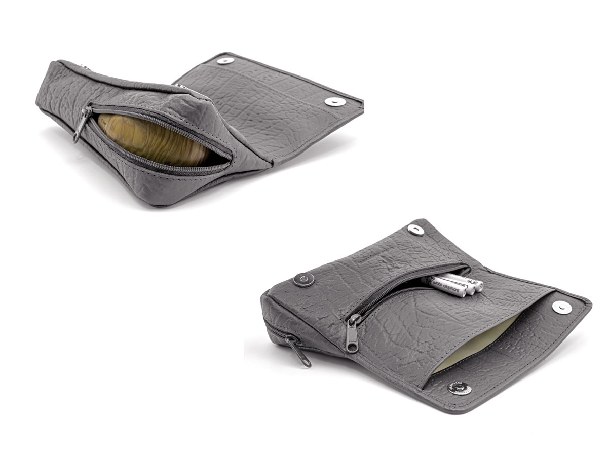 Borsa per 1 pipa realizzata con una resistente pelle bovina Loxo, che assomiglia molto alla vera pelle di elefante ed è quasi altrettanto resistente. Naturalmente, in grigio elefante. La custodia combinata con la testa di elefante profondamente incisa non è solo bella da vedere, ma si rivela anche un compagno ben studiato e compatto, con numerosi scomparti per pipe, accessori e tabacco, e dispone inoltre di due pratiche chiusure magnetiche cromate.