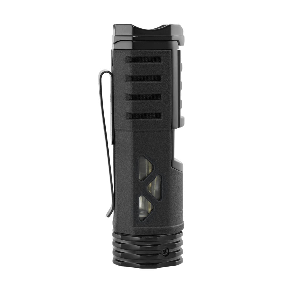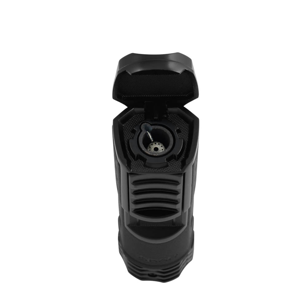 Ispiratosi a strumenti e attrezzi tattici, è progettato per garantire resistenza e prestazioni ottimali. La fiamma single large jet, ha il potere di accendere sigari grandi e ritoccare in modo accurato sigari più piccoli. il cappuccio protettivo merlato funge anche da supporto per sigari.