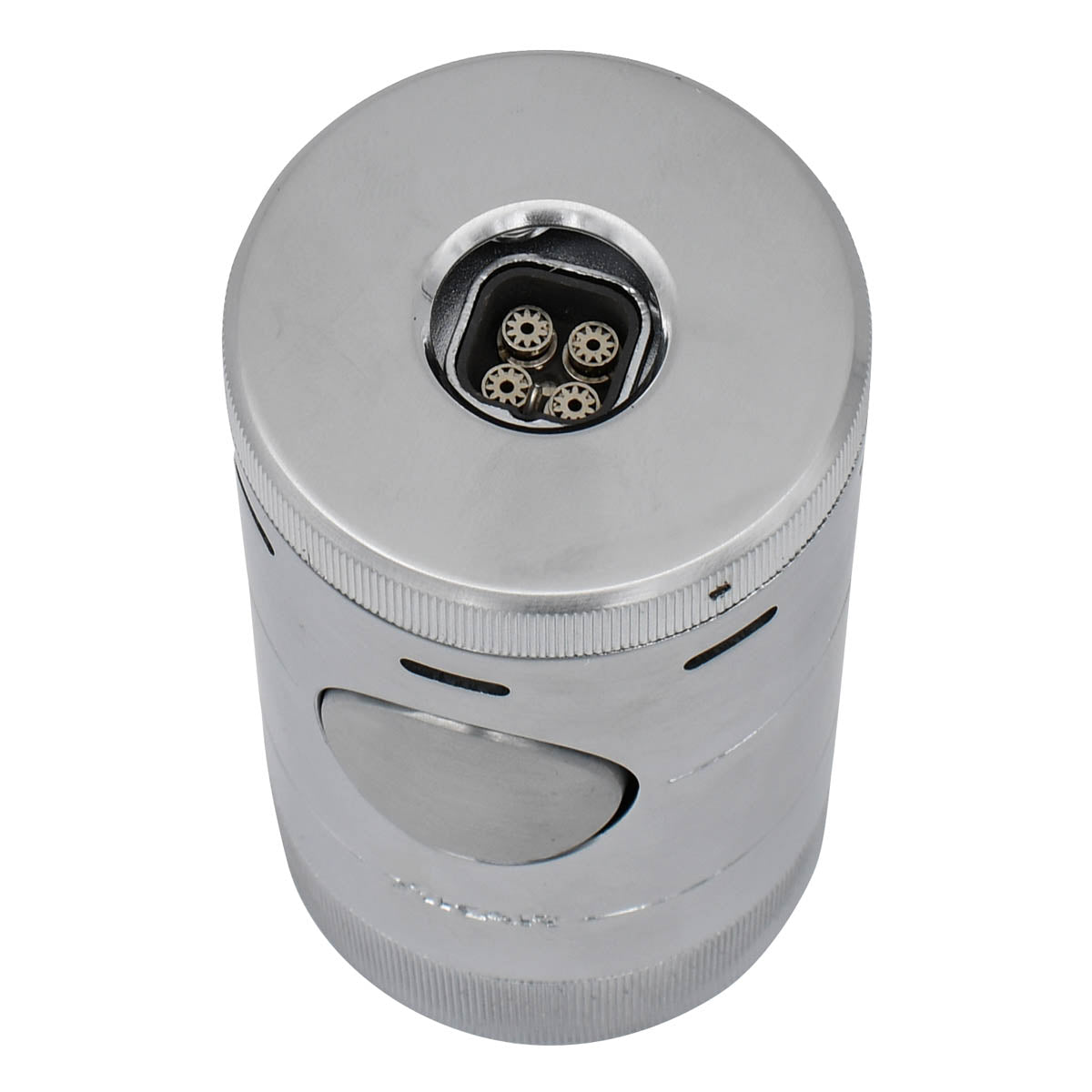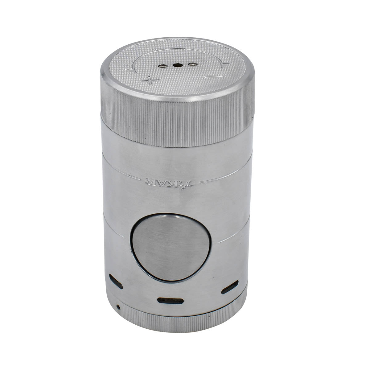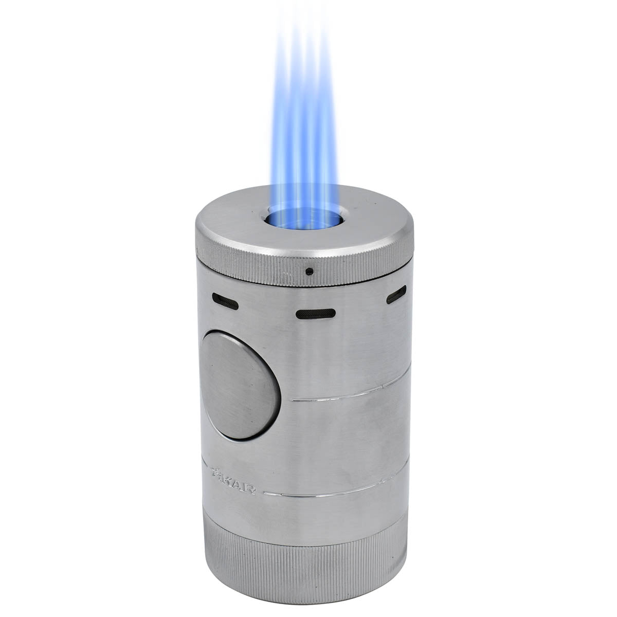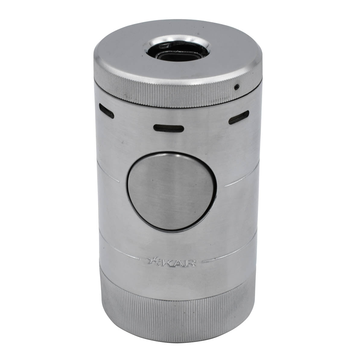 Accendisigari da tavolo cilindrico dotato di un super pulsante e di un coperchio superiore, a protezione dei quattro bruciatori, la cui apertura si ispira ad una fotocamera high-tech.