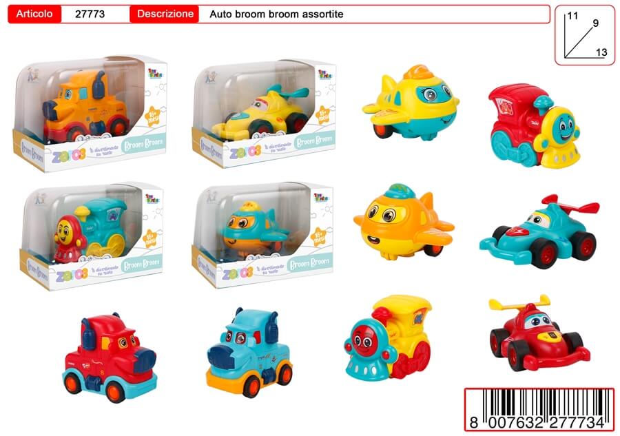 I veicoli Zero3 Broom Broom sono progettati per offrire divertimento e stimolazione ai bambini a partire dai 18 mesi. Con design allegri e colori vivaci, questi veicoli motorizzati a frizione sono perfetti per i più piccoli, fornendo un'esperienza di gioco sicura e coinvolgente.• Motorizzati a Frizione: Ogni veicolo è dotato di un meccanismo a frizione che consente di muoverlo tirandolo indietro e rilasciandolo. Questo meccanismo semplice e intuitivo aiuta i bambini a sviluppare le loro abilità motorie e a comprendere le basi del movimento.• Design Allegro e Colorato: I veicoli Zero3 sono progettati con colori vivaci e facce simpatiche che catturano l'attenzione dei bambini. Il design accattivante rende il gioco ancora più divertente e coinvolgente.• Sicurezza Garantita: Realizzati con materiali sicuri e resistenti, questi veicoli sono progettati per resistere all'uso quotidiano dei bambini piccoli. Le superfici lisce e arrotondate assicurano che non ci siano bordi taglienti, rendendoli completamente sicuri per i più piccoli.• Dimensioni Perfette: Con dimensioni di 13,5 x 9 x 8 cm, questi veicoli sono facili da afferrare e maneggiare per le manine dei bambini. Le dimensioni compatte li rendono ideali per il gioco quotidiano e facili da portare ovunque.• Varietà di Modelli: Il set include diversi tipi di veicoli come camion, aeroplani, e treni, ognuno con un design unico e accattivante. Questa varietà permette di simulare diverse situazioni di gioco, stimolando l'immaginazione dei bambini.I veicoli Zero3 Broom Broom sono il regalo perfetto per i bambini dai 18 mesi in su. La combinazione di design allegro, sicurezza e funzionalità motorizzata a frizione assicura un'esperienza di gioco unica ed educativa.
